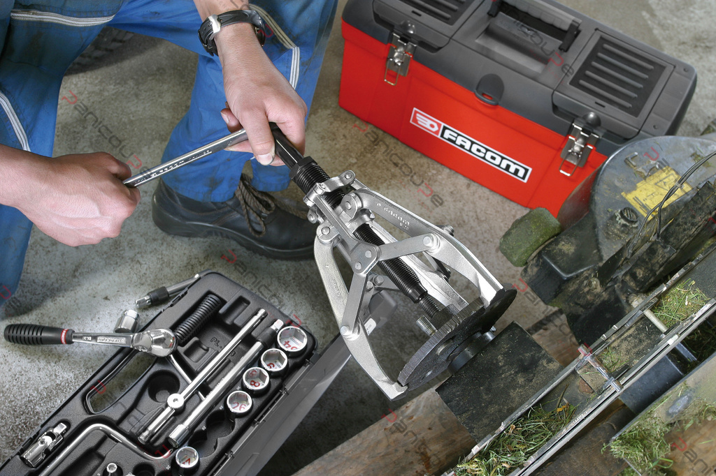 Sicherheit: Sicherungskopfschraube Vollständige Verriegelung der Klauen durch Rändelrad. Einfache Umwandlung von außen nach innen. Vielseitig: Montage in 2 oder 3 Klauen. Auszieher mit selbstklemmenden Klauen mittels einer Rückholfeder. Arretierung der Klauen am Lager mittels eines Rändelrades. Kapazität Ø 25 mm bis Ø 260 mm. Nutzbare Länge der Klauen 220 mm. Sicherheit: Arretierung der Klauen am Lager mittels einer Zentralschraube. Sicherungskopfschraube: ein Stift schert bei Überschreiten des zulässigen Drehmoments ab (mit 2 Ersatzstiften geliefert).