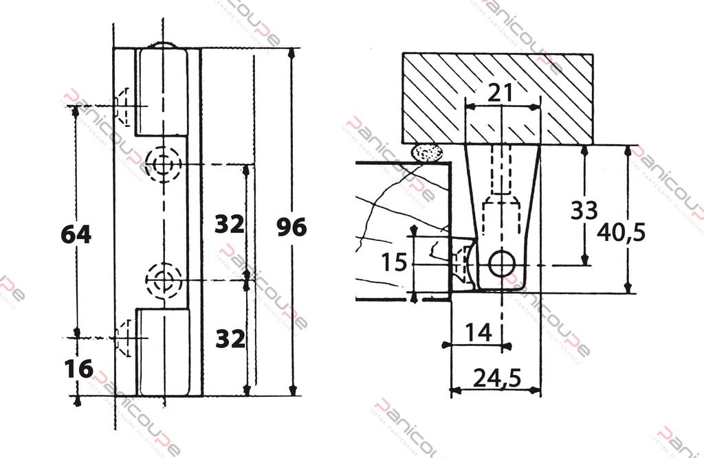 Coussinet nylon. À partir de 41 mm d’épaisseur de porte. Interchangeables gauche ou droite. Hauteur 96 mm.