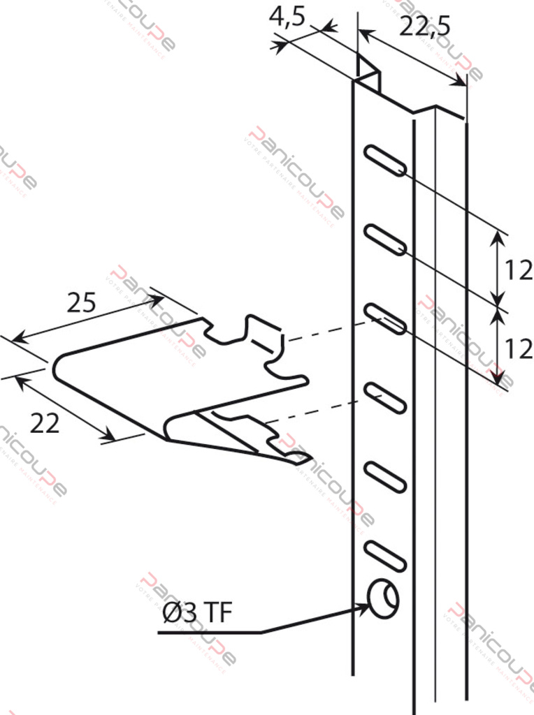 Abstand zwischen den Befestigungsbohrungen 148 mm Abstand der Kerben 12 mm Gewicht pro Meter 180 g Durchmesser der Befestigungslöcher 3 mm Länge der Klemmleiste 25 mm Breite 22 mm