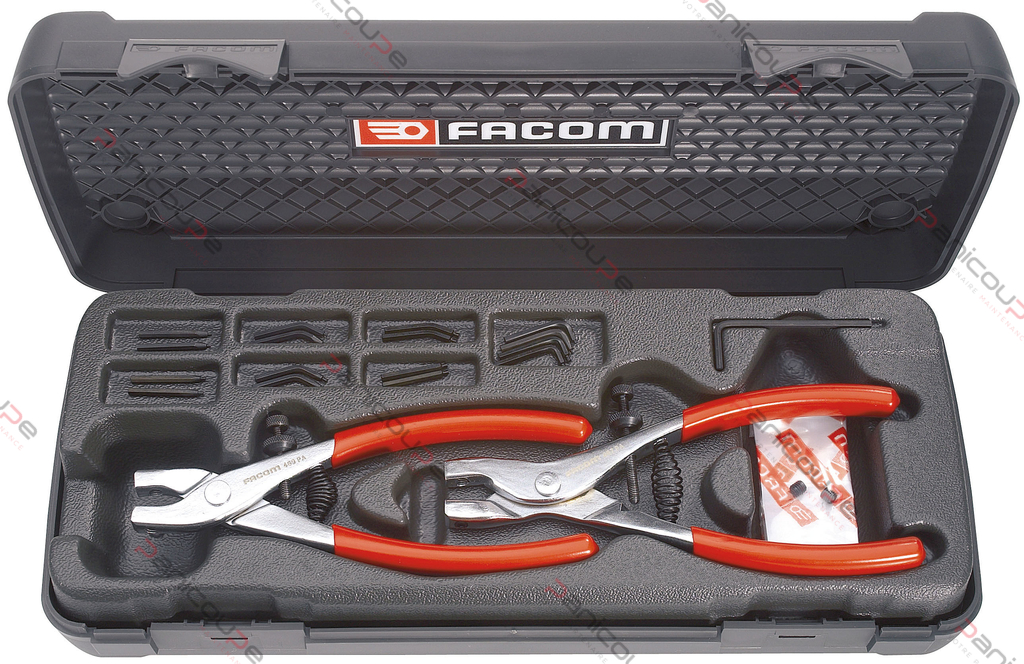 Inhalt: 18 herausnehmbare Tüllen, 1 Schließzange, 1 Öffnungszange, die die Tüllen aufnimmt, und ein Schlüssel. Das Kit ermöglicht die Handhabung von Innensicherungsringen mit einem Durchmesser von 8 bis 45 mm und Außensicherungsringen mit einem Durchmesser von 3 bis 45 mm.