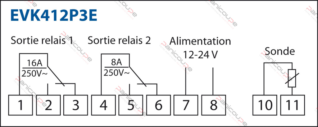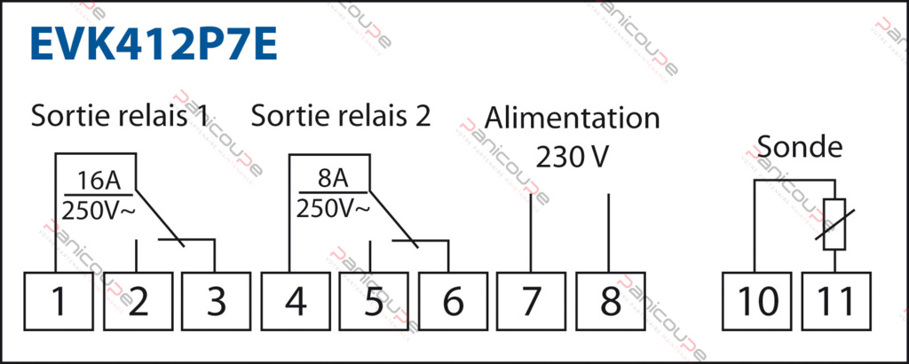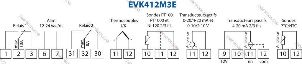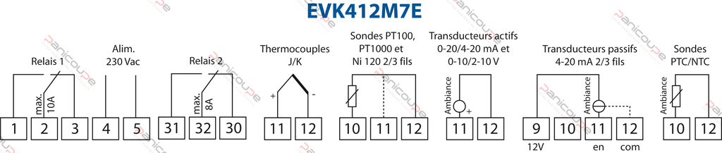Ref EVK412M7E: Sondeneingänge für „Mehrfachsonde: TCJ. TCK. PT100 2 und 3 Drähte. PT1000 2 und 3 Drähte. 4-20 mA. 0-20 mA2-10 V. 0-10 V. PTC. NTC NI120 2- und 3-Leiter (nicht mitgeliefert)” – Spannung 230 Vac
