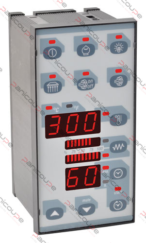 Indication par afficheur à 3 chiffres pour la température, à 2 chiffres pour la minuterie, à bargraph pour le dosage sole/voûte et leds d’indication d’état des relais.