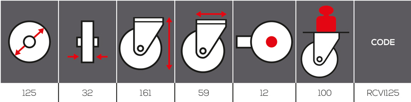 Gabelkopf und Rad aus hochwertigem Nylon, Drehpunkt auf doppelter Kugelreihe, Befestigung mit Edelstahlschraube (12 x 30), die durch das Auge geführt wird. Rad aus Polypropylen mit nicht färbender thermoplastischer Gummibandage.