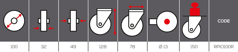 Gabelkopf aus rostfreiem Stahl. Drehpunkt auf doppelter Kugelreihe, geschraubte Radachse mit zentralem Loch. Polyamidrad mit rot eingespritzter Polyurethanbereifung.