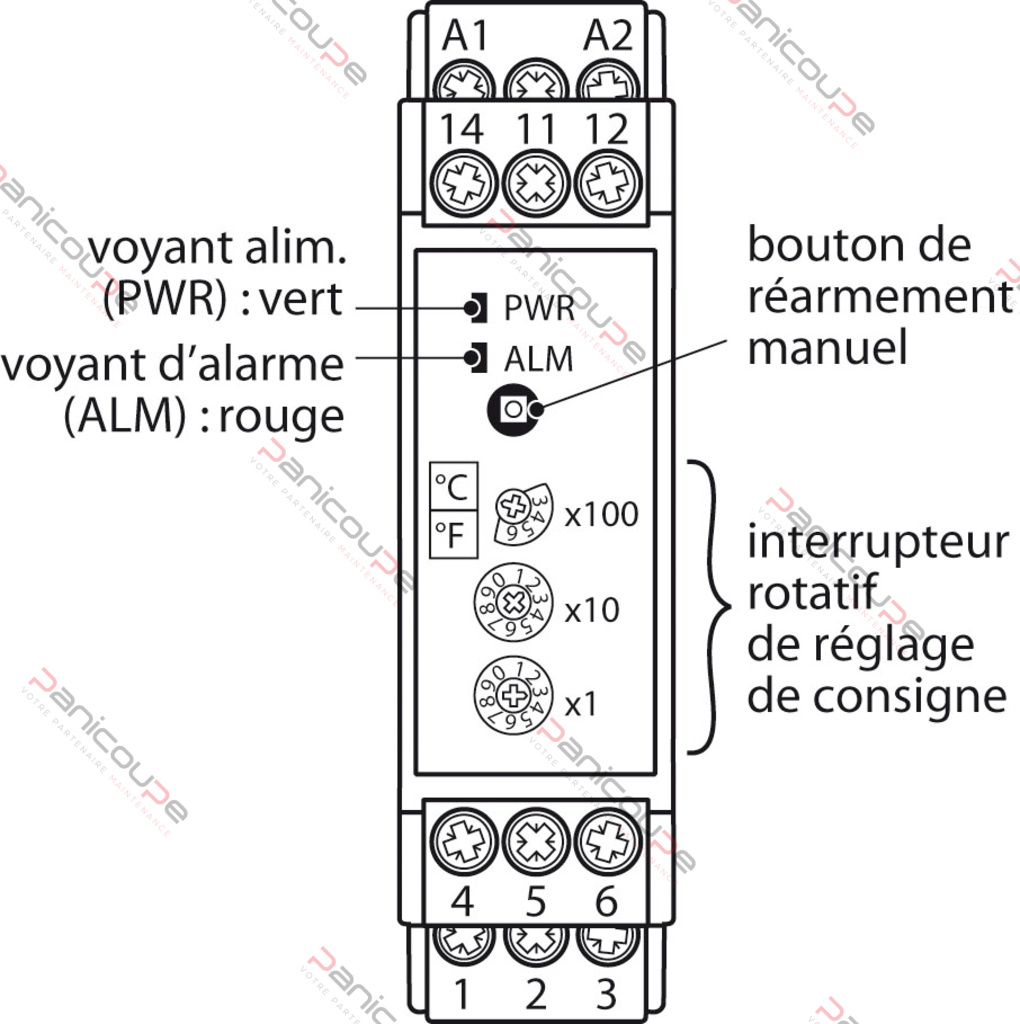 Sicherheitsthermostat mit manuellem Rückstellknopf auf der Frontplatte (Möglichkeit des Anschlusses eines externen Ferndruckknopfes) Manuelle Rückstellung abschaltbar für die Verwendung in der konventionellen Regelung. Parameterauswahl durch DIP-Schalter: • °C oder °F • Alarm für unteren und oberen Schwellenwert • Rücksetzung mit oder ohne • Sondentyp (nicht mitgeliefert) Stromversorgung 100 bis 240 Vac. Ausgang 1 WechslerSICHERHEITSRELAIS 3A/250 V DIN-Schienenmontage. Abmessungen: 90 x 100 x 22 mm Schraubklemmenanschlüsse