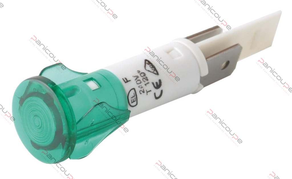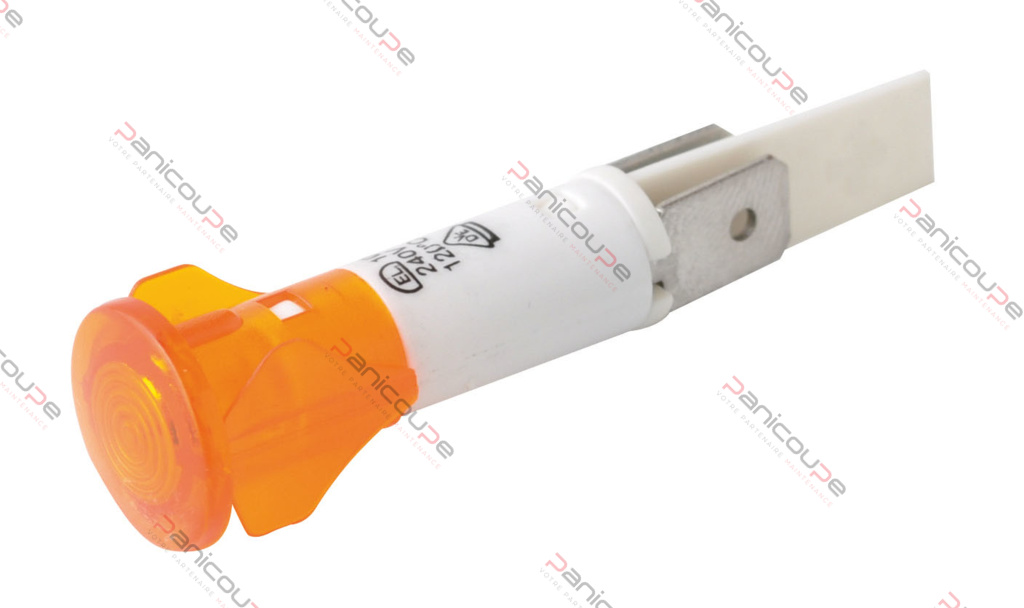 Ø ext. 13 mm pour découpe Ø 10 mm. Lampe incorporée. Corps clipsable. Raccordement par cosses 6,35 mm