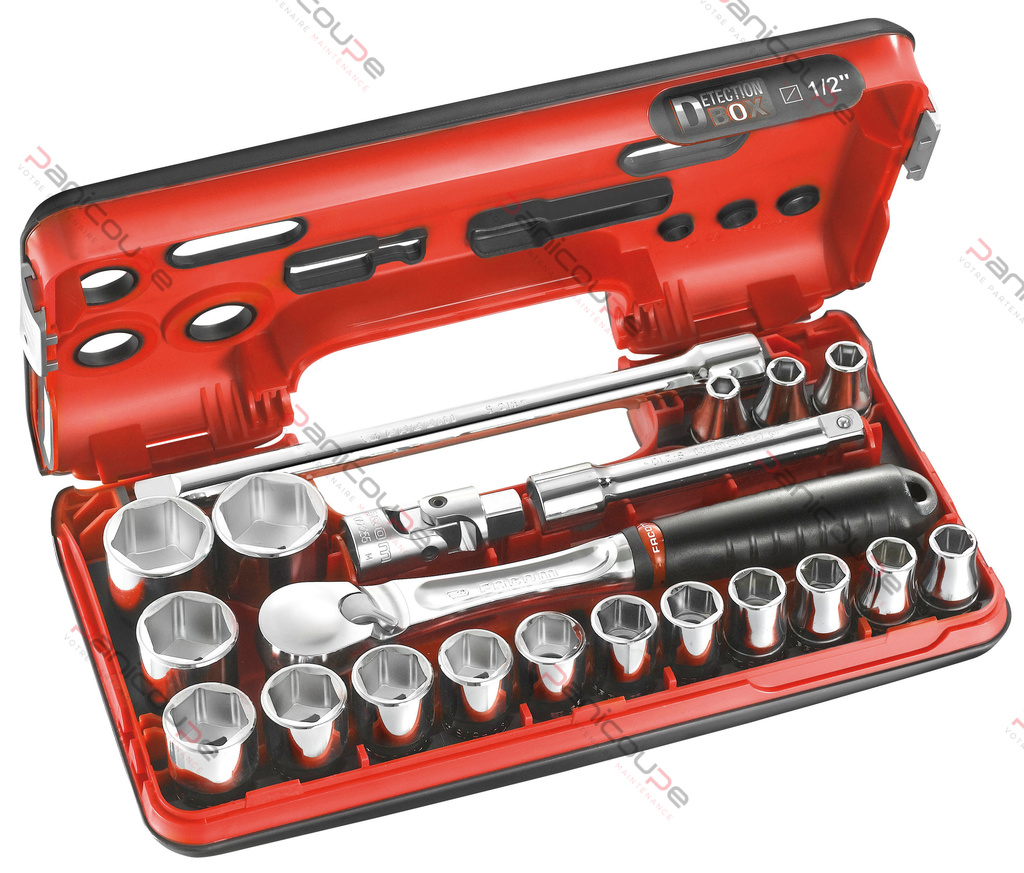 Ermöglicht eine sofortige Bestandsaufnahme auch bei geschlossenem Kasten. Leicht zu tragen, steht aufrecht. Scharniere und Klammern aus Metall. Enthält 21 Werkzeuge in einem schweren Koffer – 17 Sechskant-Einsätze von 8 bis 32 mm (8/10/11/12/13/14/15/16/17/18/19/21/22/24/27/30/32) – 1 wasserdichte Hochleistungsknarre der Serie S 1/2″ – 1 Verlängerung 130 mm – 1 Verlängerung 250 mm – 1 Kardangelenk.